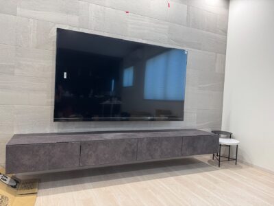 福岡市にて壁掛けテレビとウォールシェルフ、ホスクリーンの取付工事です。
