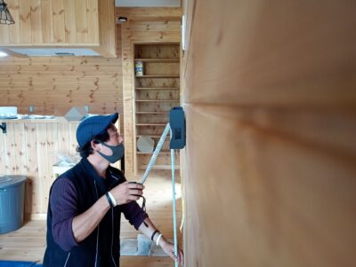 ②お客様とご一緒に設置位置の高さを決め、マスキングテープで形を出します。