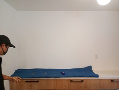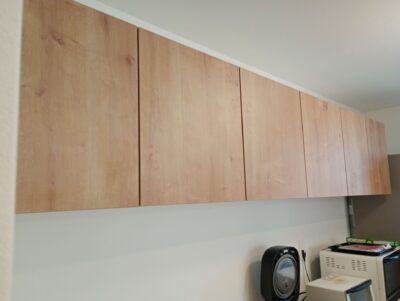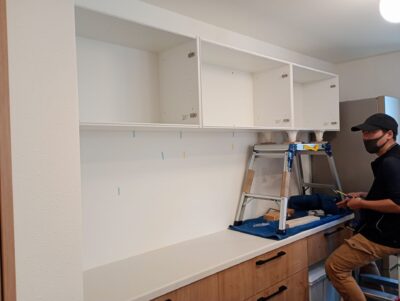 ④下地に問題がなければ扉を全て外し、付属品(エンドパネルや、巾木対応の部材はカットが必要となりますので丸鋸を使用致します。)を取り付けさせて頂きます。