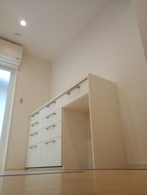 ⑥引き出し類を全て元に戻し、壁面との接触面にコーキングをして完成です。