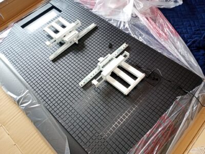 ④養生マット上で、テレビをうつ伏せに寝かせ、ご用意頂いた取付金具の中にあるテレビ側に取り付ける必要があるブラケットを取り付け、壁面側に取り付ける金具を先程取り付けたブラケットにあてがいます。
