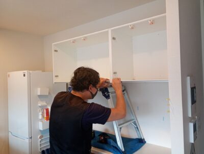 ④下地に問題がなければ扉を全て外し、付属品(エンドパネルや、巾木対応の部材はカットが必要となりますので丸鋸を使用致します。)を取り付けさせて頂きます。