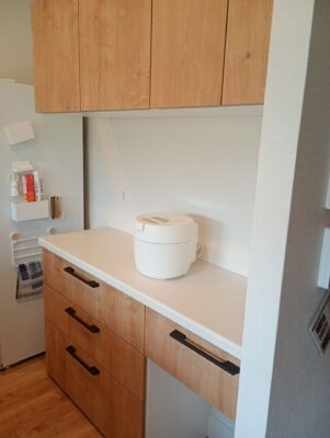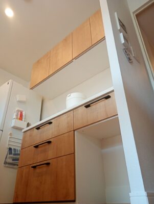 ⑥引き出し類を全て元に戻し、壁面との接触面にコーキングをして完成です。