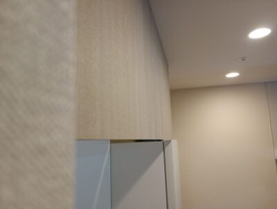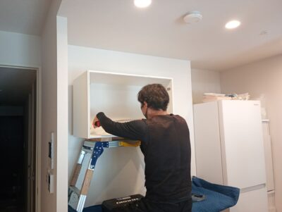 ④下地に問題がなければ扉を全て外し、付属品(エンドパネルや、巾木対応の部材はカットが必要となりますので丸鋸を使用致します。)を取り付けさせて頂きます。