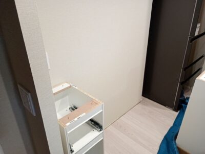 ④下地に問題がなければ扉を全て外し、付属品(エンドパネルや、巾木対応の部材はカットが必要となりますので丸鋸を使用致します。)を取り付けさせて頂きます。