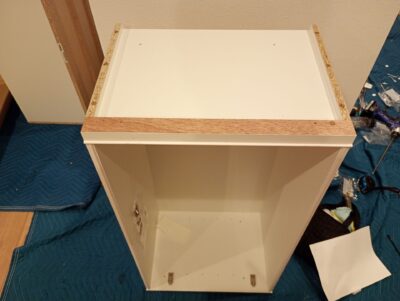 ④カップボードを設置位置に移動し、下台を連結します。(エンドパネル、巾木用の干渉板等ありカットが必要な場合は丸鋸にてカットが必要)