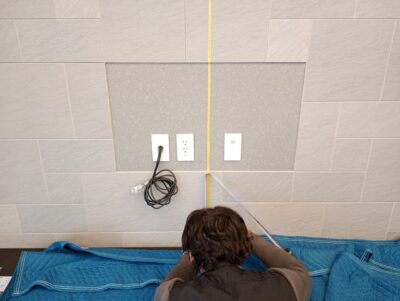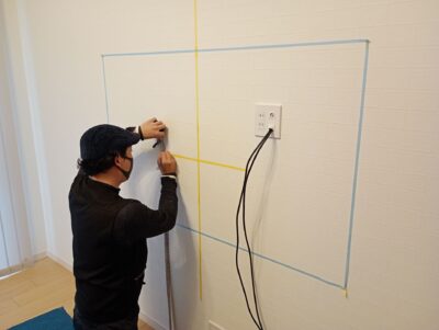 ①お客様と一緒にテレビの左右の位置となるセンターラインを決定させて頂きます。