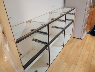 ④下地に問題がなければ扉を全て外し、付属品(エンドパネルや、巾木対応の部材はカットが必要となりますので丸鋸を使用致します。)を取り付けさせて頂きます。