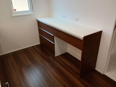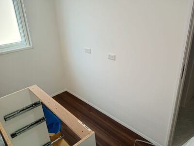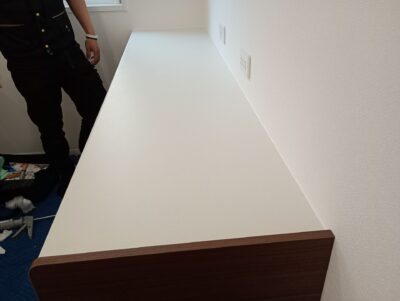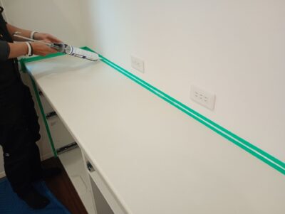⑥引き出し類を全て元に戻し、壁面との接触面にコーキングをして完成です。