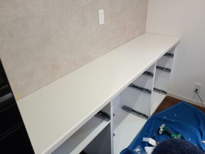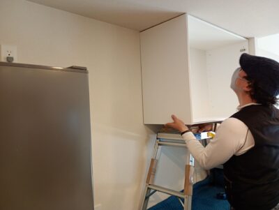 ④下地に問題がなければ扉を全て外し、付属品(エンドパネルや、巾木対応の部材はカットが必要となりますので丸鋸を使用致します。)を取り付けさせて頂きます。
