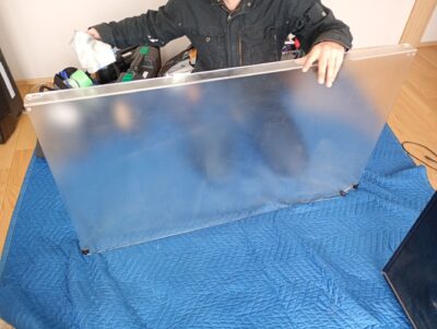 ④養生マット上で、テレビをうつ伏せに寝かせ、ご用意頂いた取付金具の中にあるテレビ側に取り付ける必要があるブラケットを取り付け、壁面側に取り付ける金具を先程取り付けたブラケットにあてがいます。
