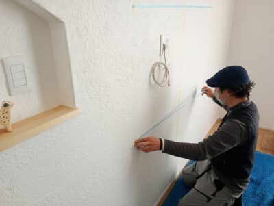 ②お客様とご一緒に設置位置の高さを決め、マスキングテープで形を出します。