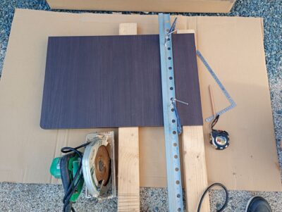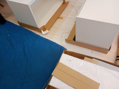 ④下地に問題がなければ扉を全て外し、付属品(エンドパネルや、巾木対応の部材はカットが必要となりますので丸鋸を使用致します。)を取り付けさせて頂きます。